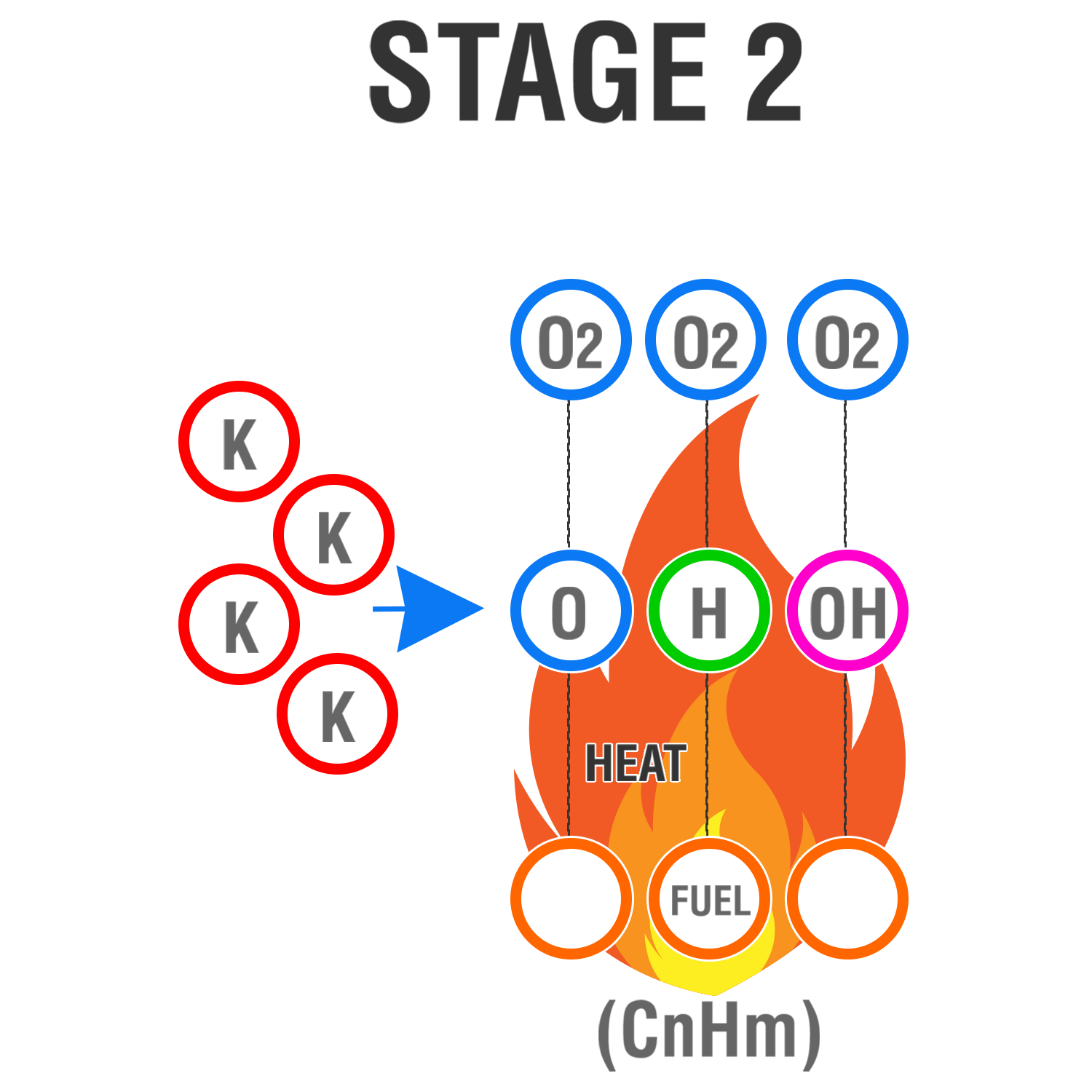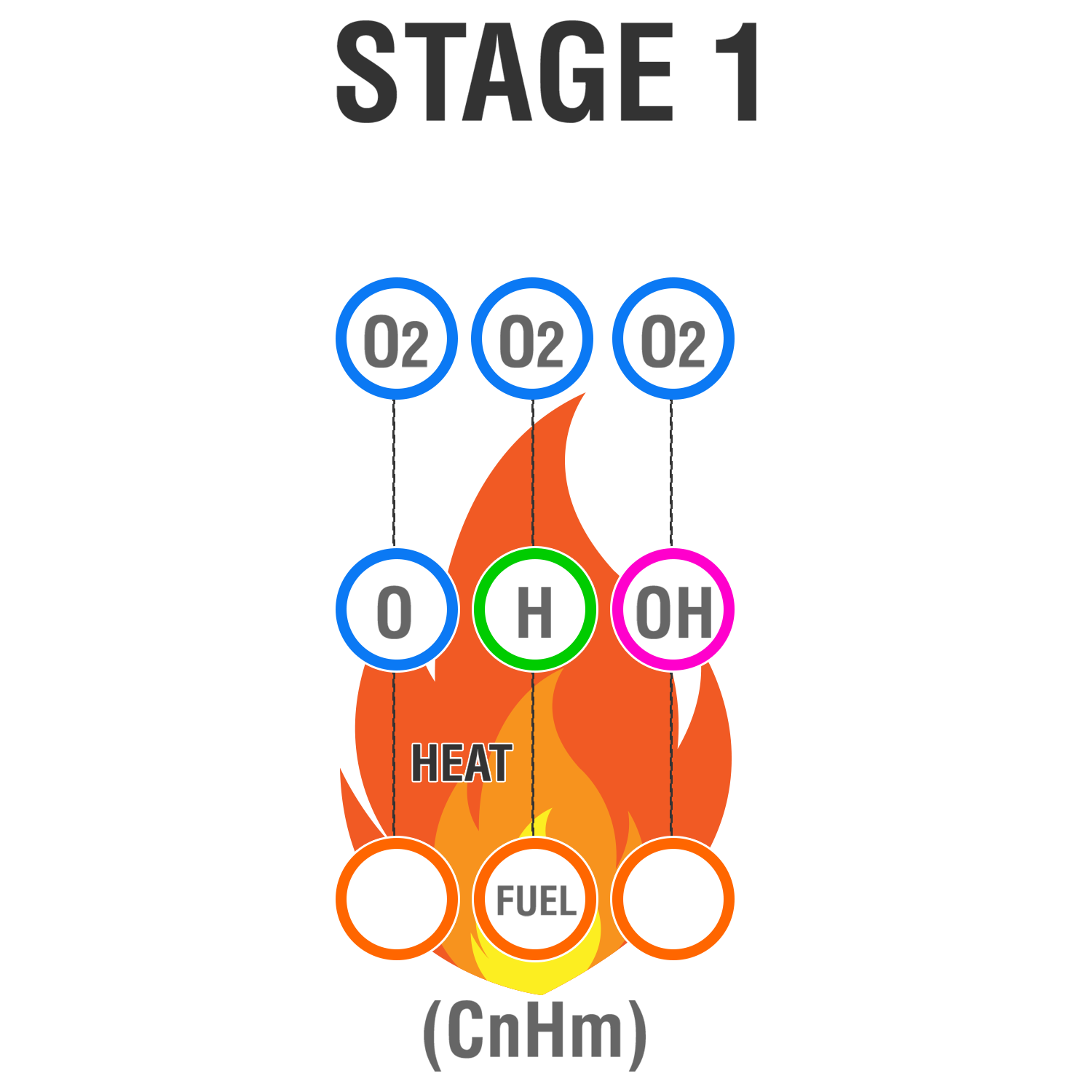 Fire is initiated by the flame chain carriers: O, H and OH