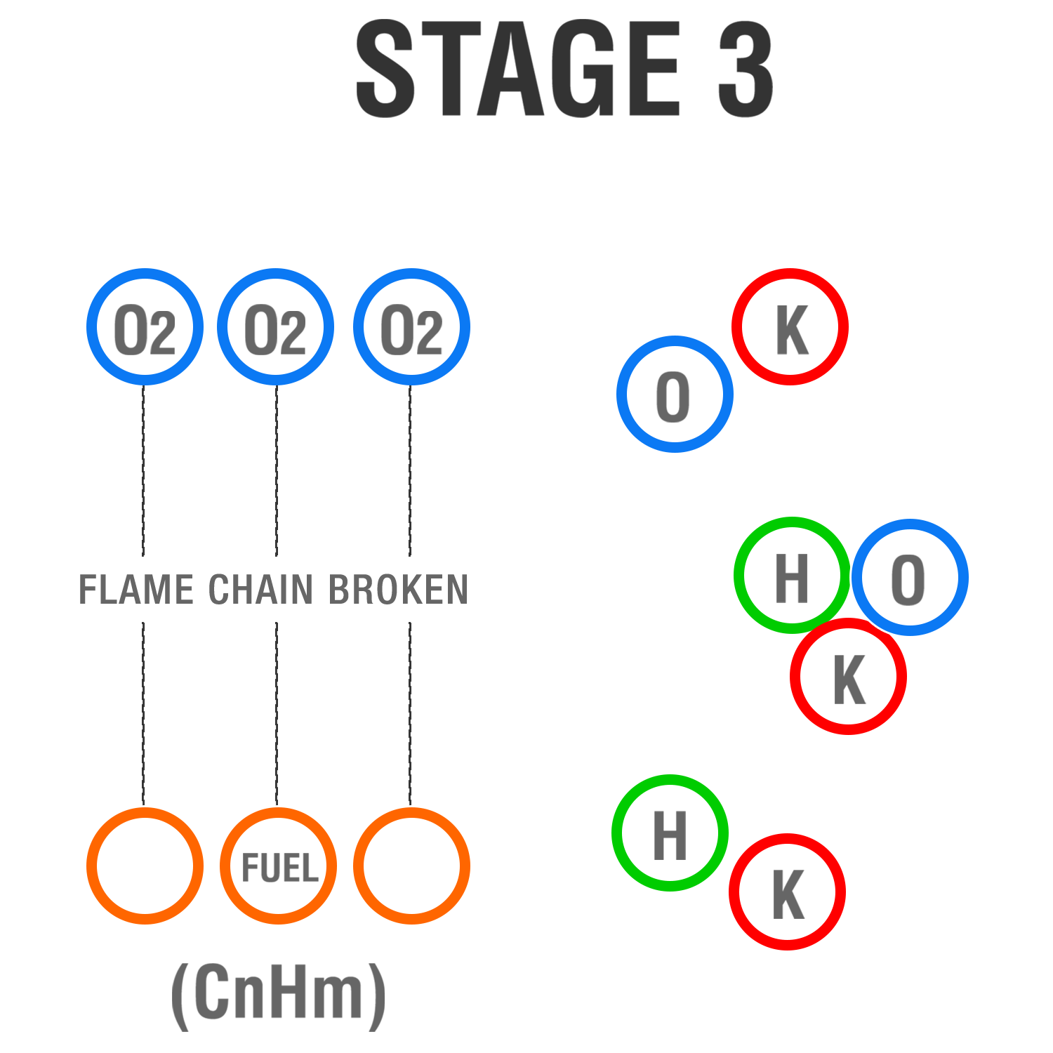 Through the two reactions, a quick oxidation process takes place, immediately transforming the jet from a solid state into a gaseous state freeing the potassium particles. These atoms are able to intercept and interrupt any other free particles produced by the fire’s natural chain reaction combustion process.
