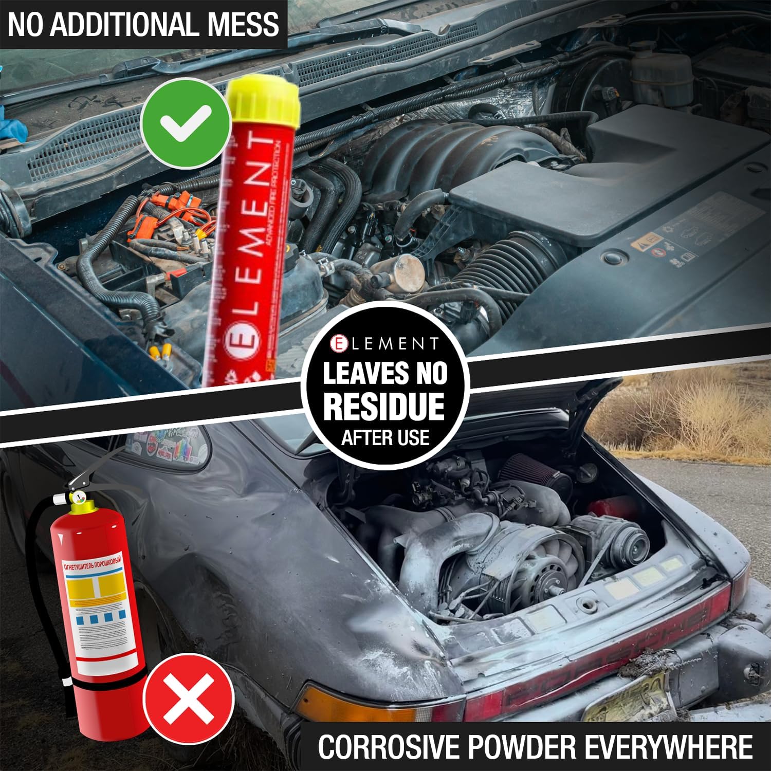 Element interrupts the chemical chain reaction of fire which extinguishes with no mess or corrosive powders. Fire is bad enough, your extinguisher shouldn't make it worse.