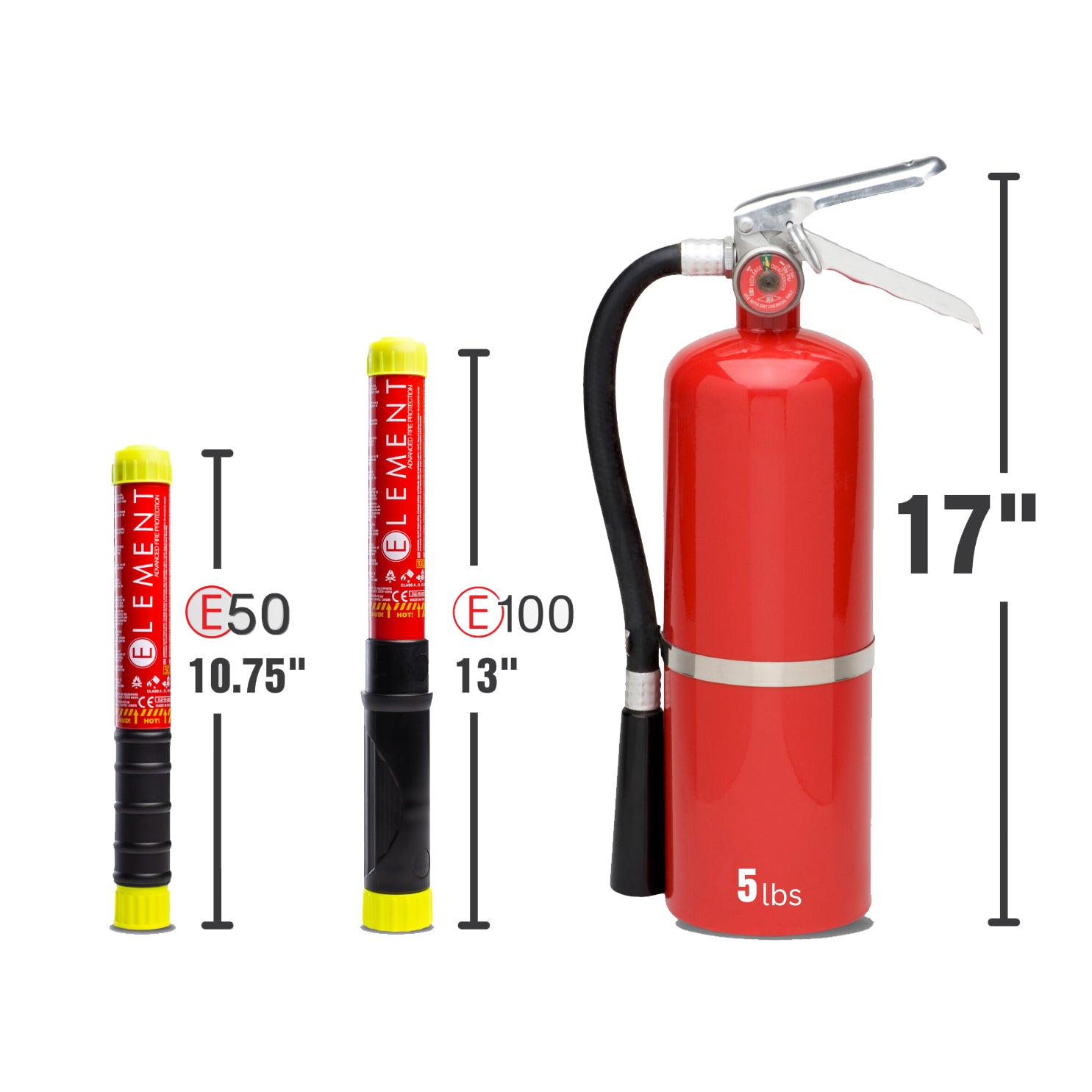 The E50 is less than 11” in length and under 300 grams making Element the world's smallest and longest lasting clean agent fire extinguisher, perfect to carry on your bike.